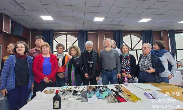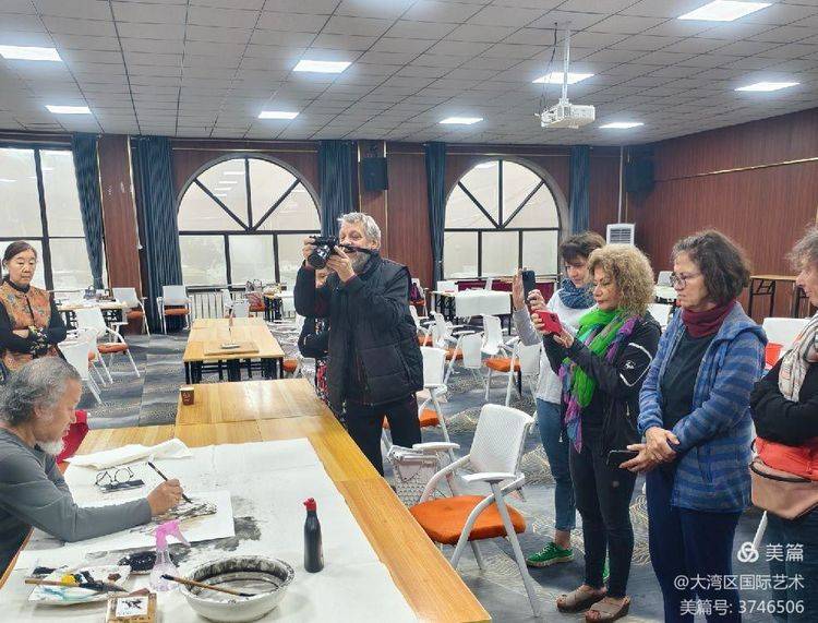 德国艺术家观看画家武剑飞教授现场创作重彩绘画。